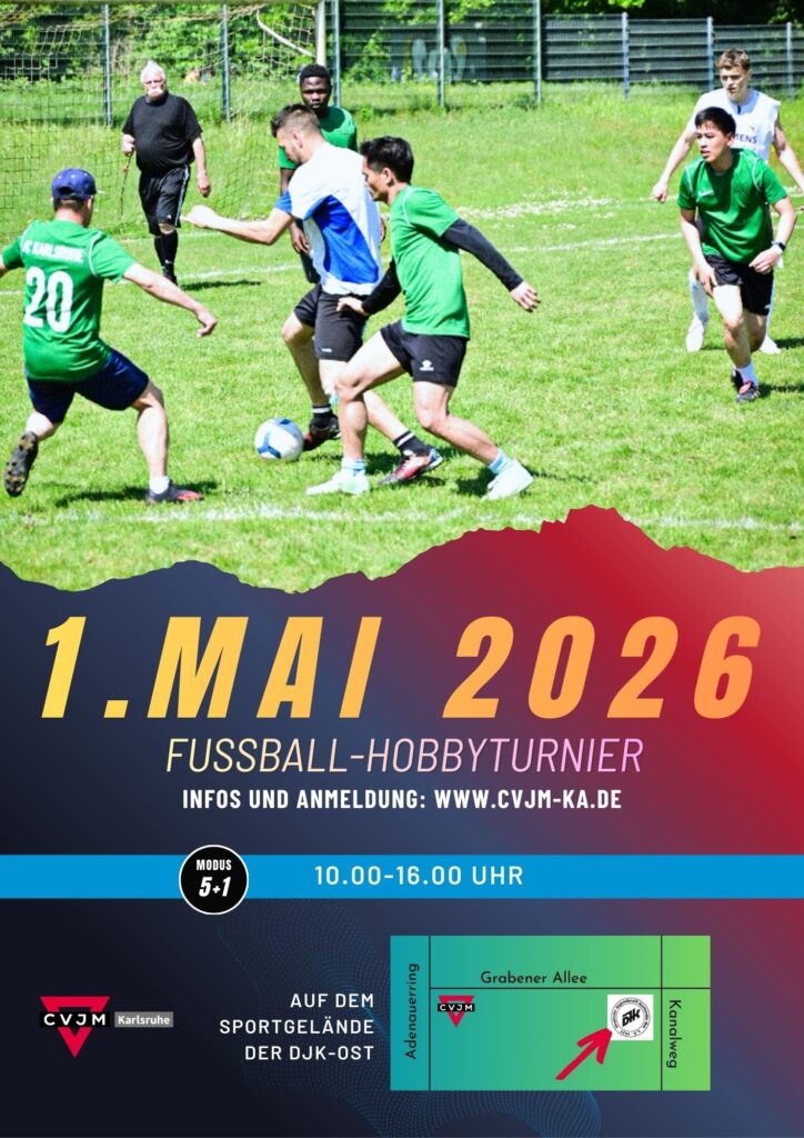 Das CVJM Hobby-Fussballturnier am 1. Mai ist wieder da! Melde dich mit deiner Mannschaft an und kämpfe um die Hardtwald-Meisterschaft. Das Turnier findet auch dieses Jahr wieder auf dem benachtbarten Sportplatz der DJK Karlsruhe-Ost (Beschreibung siehe unten) statt.
