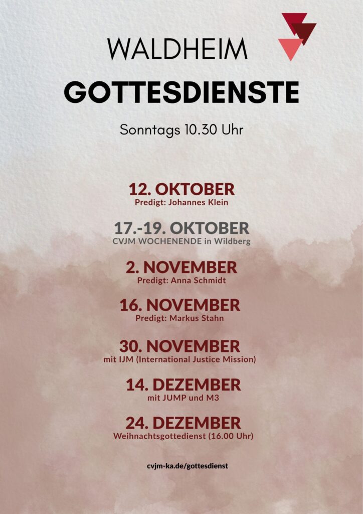 Alle Gottesdienste finden im oder vor dem CVJM Waldheim, Grabener Allee 4-6, statt.